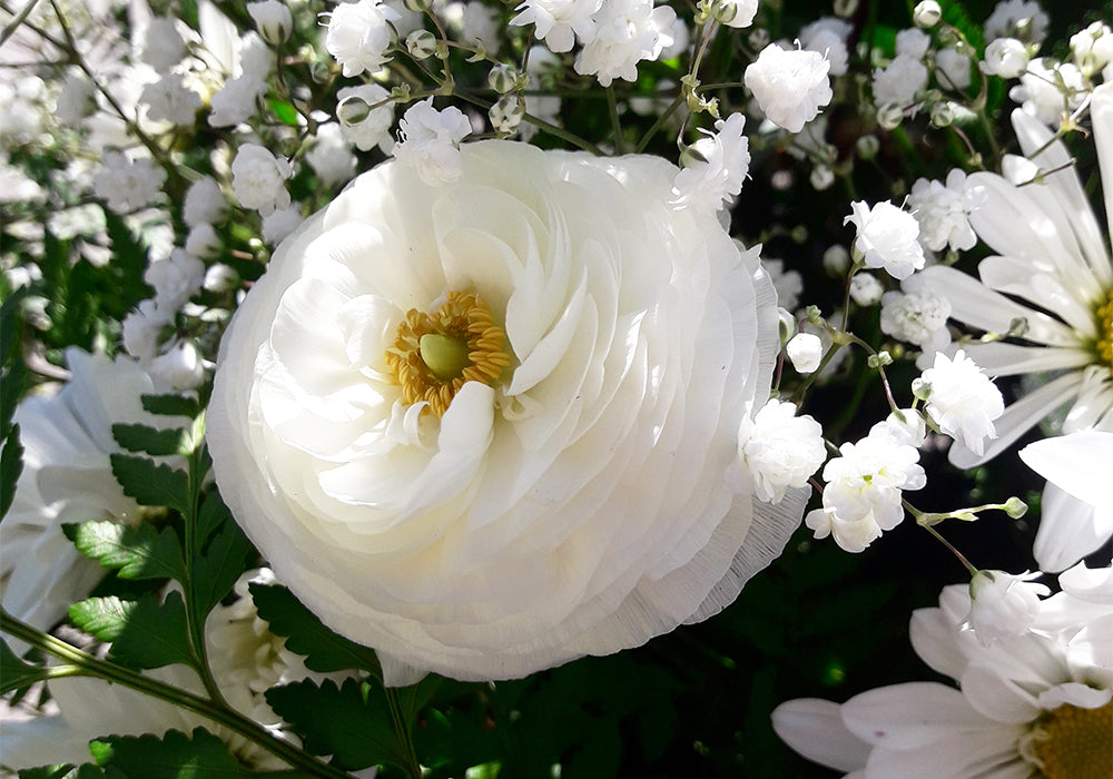 Arreglos de flores blancas, siempre frescas y con follaje de la estación.